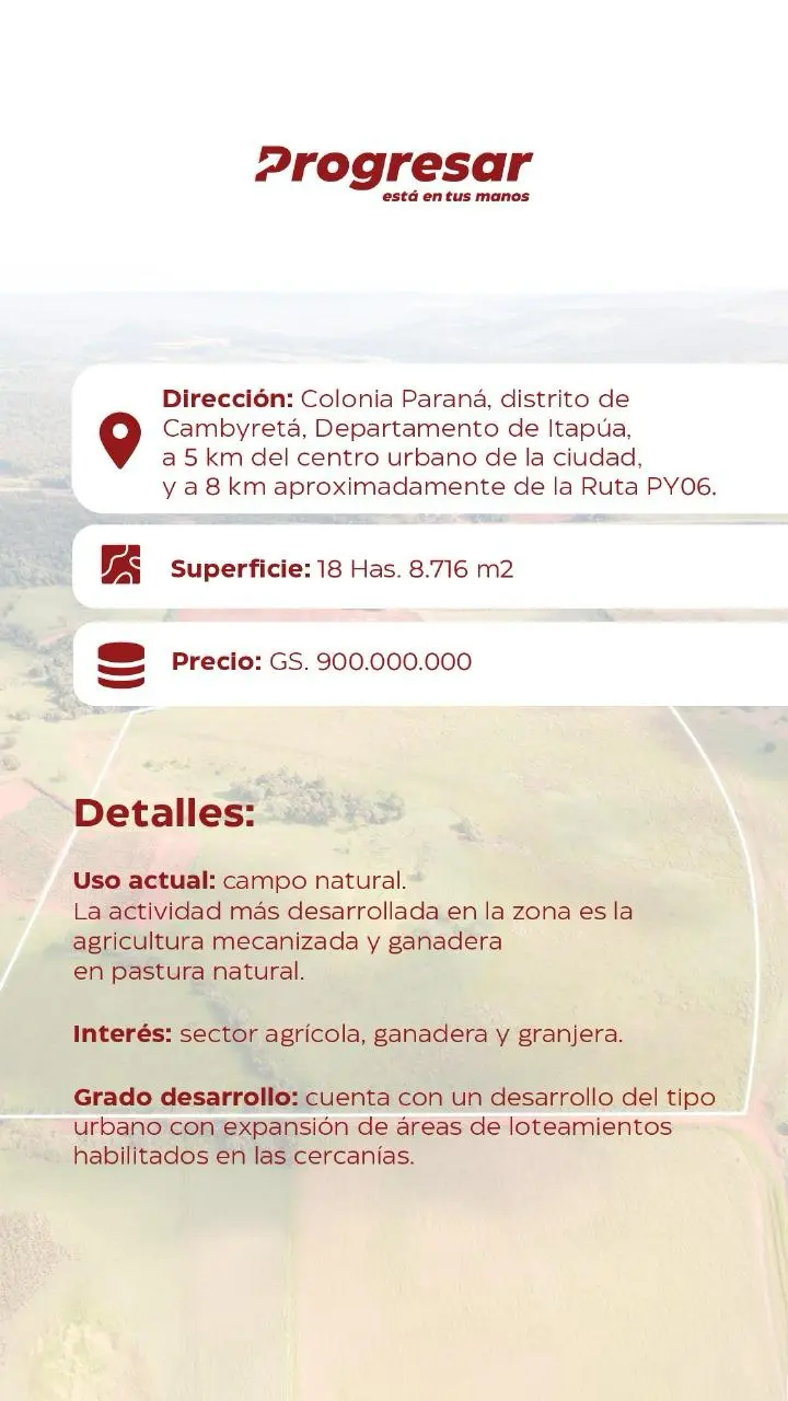 Se ofrece en venta un amplio terreno ubicado en plena zona de campo, con una superficie total de 18 hectáreas 8.716 m².